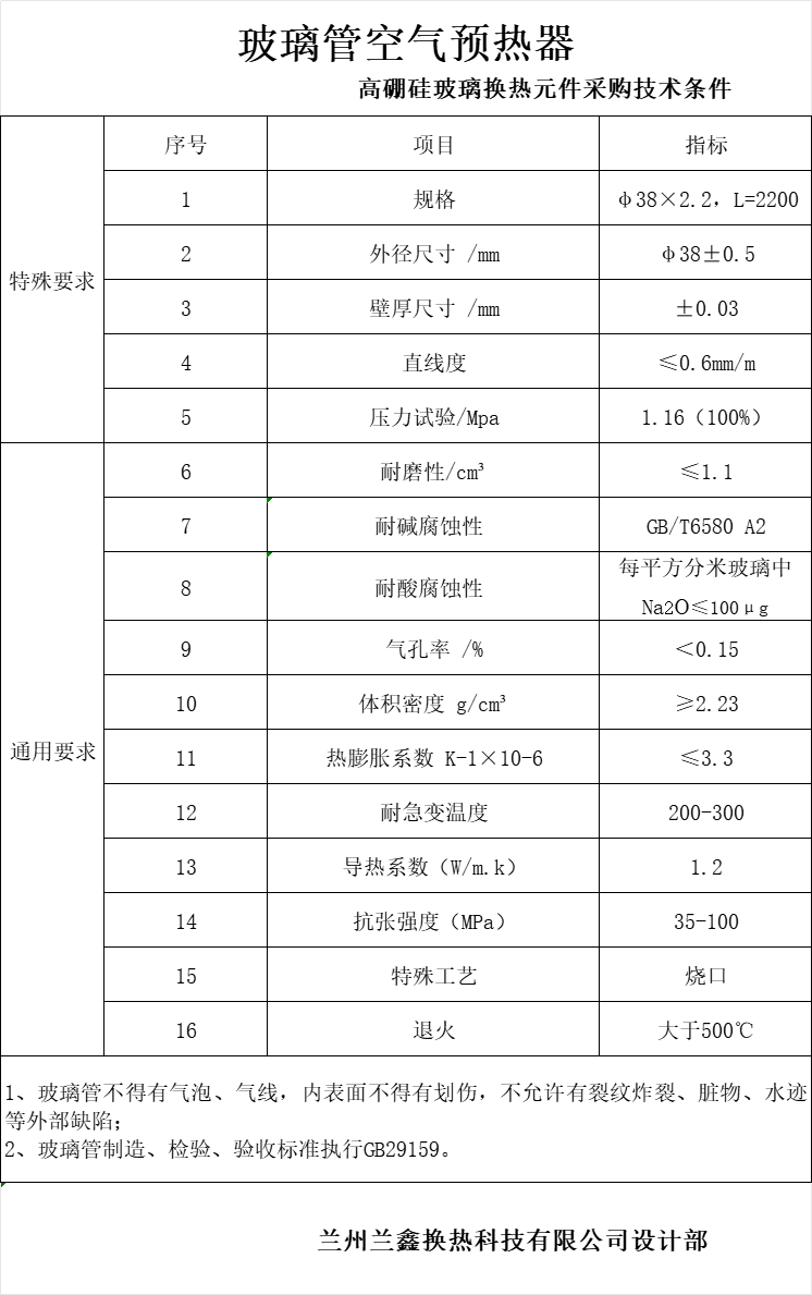 兰州兰鑫换热科技有限公司 | 玻璃管空气预热器换热元件采购技术条件